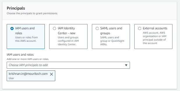 - Setup the Data Lake permissions: In this step, you apply the rules of LF for IAM users.